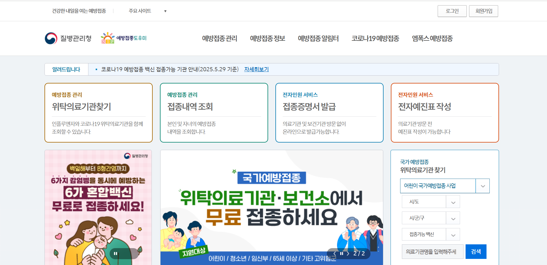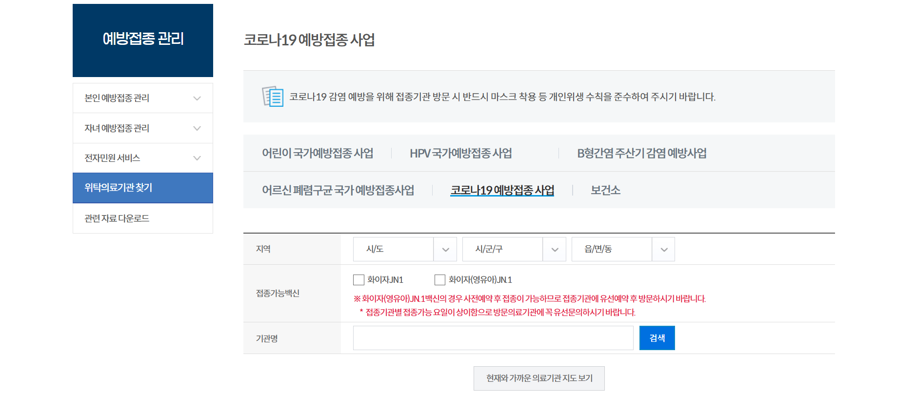 (경로: 예방접종관리 > 지정의료기관 찾기)