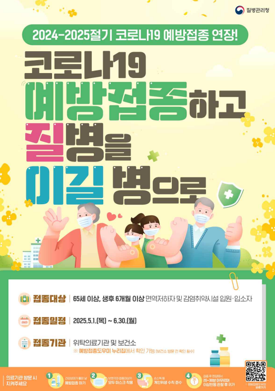 정부는 이를 감안하여 24-25 절기 코로나 예방접종 기간을 6월 30일까지 연장했고, 백신 미접종 고위험군은 지금이라도 늦지 않게 코로나 예방접종을 맞을 것을 당부하고 있습니다.